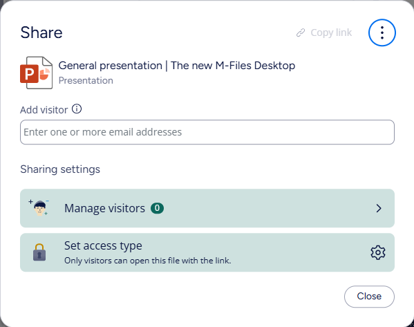 - M-Files Sharing Center. Sharing Center introduces a new centralized sharing for external collaboration in the new M-Files Desktop and Web. It offers a unified interface for sharing, tracking, and managing access. This initial release introduces capability to create Visitor Links with the new M-Files clients.Read more: M-Files Sharing Center.