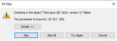 DocumentCache.cpp, 7509, Script execution failed. ((BeforeCheckInChangesFinalize::PropertyCalculator.MFEventHandlerBeforeCheckInChangesFinalize: 1624-1)) (0x800408BB) DocumentCache.cpp, 19216, Script execution failed. ((BeforeCheckInChangesFinalize::PropertyCalculator.MFEventHandlerBeforeCheckInChangesFinalize: 1624-1)) (0x800408BB) RPCMethodCallWithRetry.h, 27, Script execution failed. ((BeforeCheckInChangesFinalize::PropertyCalculator.MFEventHandlerBeforeCheckInChangesFinalize: 1624-1)) (0x800408BB) RPCMethodCallWithRetry.h, 27, Script execution failed. ((BeforeCheckInChangesFinalize::PropertyCalculator.MFEventHandlerBeforeCheckInChangesFinalize: 1624-1)) (0x800408BB) RPCDocumentOperations.cpp, 11772, Script execution failed. ((BeforeCheckInChangesFinalize::PropertyCalculator.MFEventHandlerBeforeCheckInChangesFinalize: 1624-1)) (0x800408BB) RPCDocumentOperations.cpp, 5811, Script execution failed. ((BeforeCheckInChangesFinalize::PropertyCalculator.MFEventHandlerBeforeCheckInChangesFinalize: 1624-1)) (0x800408BB) MCallInLoop.h, 712, Script execution failed. ((BeforeCheckInChangesFinalize::PropertyCalculator.MFEventHandlerBeforeCheckInChangesFinalize: 1624-1)) (0x800408BB) RPCDocumentOperationsHelper.cpp, 1939, Script execution failed. ((BeforeCheckInChangesFinalize::PropertyCalculator.MFEventHandlerBeforeCheckInChangesFinalize: 1624-1)) (0x800408BB) RPCDocumentOperationsHelperPrivate.cpp, 208, Script execution failed. ((BeforeCheckInChangesFinalize::PropertyCalculator.MFEventHandlerBeforeCheckInChangesFinalize: 1624-1)) (0x800408BB) RPCDocumentOperationsHelper.cpp, 9432, Script execution failed. ((BeforeCheckInChangesFinalize::PropertyCalculator.MFEventHandlerBeforeCheckInChangesFinalize: 1624-1)) (0x800408BB) RPCDocumentOperationsHelper.cpp, 10128, Script execution failed. ((BeforeCheckInChangesFinalize::PropertyCalculator.MFEventHandlerBeforeCheckInChangesFinalize: 1624-1)) (0x800408BB) VaultDBSessionEvents.cpp, 380, Script execution failed. ((BeforeCheckInChangesFinalize::PropertyCalculator.MFEventHandlerBeforeCheckInChangesFinalize: 1624-1)) (0x800408BB) VaultDBSessionEvents.cpp, 1690, Script execution failed. ((BeforeCheckInChangesFinalize::PropertyCalculator.MFEventHandlerBeforeCheckInChangesFinalize: 1624-1)) (0x800408BB) VaultScriptSessionTemplates.cpp, 275, Script execution failed. ((BeforeCheckInChangesFinalize::PropertyCalculator.MFEventHandlerBeforeCheckInChangesFinalize: 1624-1)) (0x800408BB) VaultScriptSessionTemplates.cpp, 340, Script execution failed. ((BeforeCheckInChangesFinalize::PropertyCalculator.MFEventHandlerBeforeCheckInChangesFinalize: 1624-1)) (0x800408BB) VaultScriptSessionTemplates.cpp, 340, The parameter is incorrect. (6-727, 106) (0x80070057) VaultScriptSessionTemplates.cpp, 523, The parameter is incorrect. (6-727, 106) (0x80070057) CoActiveScriptSite.cpp, 895, The parameter is incorrect. (6-727, 106) (0x80070057) CoActiveScriptSite.cpp, 737, The parameter is incorrect. (6-727, 106) (0x80070057) BeforeCheckInChangesFinalize::PropertyCalculator.MFEventHandlerBeforeCheckInChangesFinalize, 22, The parameter is incorrect. (6-727, 106) (0x80070057) CoDynamicCLRObjectWrapper.cpp, 552, The parameter is incorrect. (6-727, 106) (0x80070057) CoDynamicCLRObjectWrapper.cpp, 322, The parameter is incorrect. (6-727, 106) (0x80070057) ManagedError.cpp, 150, The parameter is incorrect. (6-727, 106) (0x80070057) VaultApplicationBase.cs, 257 (IL:45), The parameter is incorrect. (6-727, 106) (0x80070057) VaultApplicationBase.cs, 809 (IL:82), The parameter is incorrect. (6-727, 106) (0x80070057) MethodInfo.cs, 224 (IL:105), The parameter is incorrect. (6-727, 106) (0x80070057) CoreFunctionality.cs, 944 (IL:0), The parameter is incorrect. (6-727, 106) (0x80070057) ObjVerEx.cs, 1616 (IL:56), The parameter is incorrect. (6-727, 106) (0x80070057) PropertyCalculator 2.0.1: [MFilesAPI.ObjectVersionAndProperties SetAllProperties(MFilesAPI.ObjVer, Boolean, MFilesAPI.PropertyValues)], IL:-1, The parameter is incorrect. (6-727, 106) (0x80070057) CoVaultObjectPropertyOperations.cpp, 978, The parameter is incorrect. (6-727, 106) (0x80070057) CoVaultObjectPropertyOperations.cpp, 1004, The parameter is incorrect. (6-727, 106) (0x80070057) CoVaultObjectPropertyOperations.cpp, 1080, The parameter is incorrect. (6-727, 106) (0x80070057) ServerVaultObjectPropertyOperationsHelper.cpp, 415, The parameter is incorrect. (6-727, 106) (0x80070057) RPCObjectOperationsHelper.cpp, 109, The parameter is incorrect. (6-727, 106) (0x80070057) CoRPCOverCOM.cpp, 6808, The parameter is incorrect. (6-727, 106) (0x80070057) RPCDocumentOperations.cpp, 7389, The parameter is incorrect. (6-727, 106) (0x80070057) MCallInLoop.h, 712, The parameter is incorrect. (6-727, 106) (0x80070057) RPCDocumentOperationsHelper.cpp, 4192, The parameter is incorrect. (6-727, 106) (0x80070057) RPCDocumentOperationsHelper.cpp, 3724, The parameter is incorrect. (6-727, 106) (0x80070057) RPCDocumentOperationsHelperPrivate.cpp, 7499, The parameter is incorrect. (6-727, 106) (0x80070057) RPCDocumentOperationsHelperPrivate.cpp, 6947, The parameter is incorrect. (6-727, 106) (0x80070057) RPCDocumentOperationsHelperPrivate.cpp, 8843, The parameter is incorrect. (6-727, 106) (0x80070057) RPCDocumentOperationsHelperPrivate.cpp, 9621, The parameter is incorrect. (6-727, 106) (0x80070057) RPCObjectTypesHelper.cpp, 2393, The parameter is incorrect. (6-727, 106) (0x80070057) (M-Files 22.4.11321.4 2022-07-27T06:45:40.408Z)