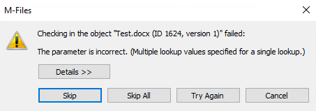 DocumentCache.cpp, 7509, Script execution failed. ((BeforeCheckInChangesFinalize::PropertyCalculator.MFEventHandlerBeforeCheckInChangesFinalize: 1624-1)) (0x800408BB) DocumentCache.cpp, 19216, Script execution failed. ((BeforeCheckInChangesFinalize::PropertyCalculator.MFEventHandlerBeforeCheckInChangesFinalize: 1624-1)) (0x800408BB) RPCMethodCallWithRetry.h, 27, Script execution failed. ((BeforeCheckInChangesFinalize::PropertyCalculator.MFEventHandlerBeforeCheckInChangesFinalize: 1624-1)) (0x800408BB) RPCMethodCallWithRetry.h, 27, Script execution failed. ((BeforeCheckInChangesFinalize::PropertyCalculator.MFEventHandlerBeforeCheckInChangesFinalize: 1624-1)) (0x800408BB) RPCDocumentOperations.cpp, 11772, Script execution failed. ((BeforeCheckInChangesFinalize::PropertyCalculator.MFEventHandlerBeforeCheckInChangesFinalize: 1624-1)) (0x800408BB) RPCDocumentOperations.cpp, 5811, Script execution failed. ((BeforeCheckInChangesFinalize::PropertyCalculator.MFEventHandlerBeforeCheckInChangesFinalize: 1624-1)) (0x800408BB) MCallInLoop.h, 712, Script execution failed. ((BeforeCheckInChangesFinalize::PropertyCalculator.MFEventHandlerBeforeCheckInChangesFinalize: 1624-1)) (0x800408BB) RPCDocumentOperationsHelper.cpp, 1939, Script execution failed. ((BeforeCheckInChangesFinalize::PropertyCalculator.MFEventHandlerBeforeCheckInChangesFinalize: 1624-1)) (0x800408BB) RPCDocumentOperationsHelperPrivate.cpp, 208, Script execution failed. ((BeforeCheckInChangesFinalize::PropertyCalculator.MFEventHandlerBeforeCheckInChangesFinalize: 1624-1)) (0x800408BB) RPCDocumentOperationsHelper.cpp, 9432, Script execution failed. ((BeforeCheckInChangesFinalize::PropertyCalculator.MFEventHandlerBeforeCheckInChangesFinalize: 1624-1)) (0x800408BB) RPCDocumentOperationsHelper.cpp, 10128, Script execution failed. ((BeforeCheckInChangesFinalize::PropertyCalculator.MFEventHandlerBeforeCheckInChangesFinalize: 1624-1)) (0x800408BB) VaultDBSessionEvents.cpp, 380, Script execution failed. ((BeforeCheckInChangesFinalize::PropertyCalculator.MFEventHandlerBeforeCheckInChangesFinalize: 1624-1)) (0x800408BB) VaultDBSessionEvents.cpp, 1690, Script execution failed. ((BeforeCheckInChangesFinalize::PropertyCalculator.MFEventHandlerBeforeCheckInChangesFinalize: 1624-1)) (0x800408BB) VaultScriptSessionTemplates.cpp, 275, Script execution failed. ((BeforeCheckInChangesFinalize::PropertyCalculator.MFEventHandlerBeforeCheckInChangesFinalize: 1624-1)) (0x800408BB) VaultScriptSessionTemplates.cpp, 340, Script execution failed. ((BeforeCheckInChangesFinalize::PropertyCalculator.MFEventHandlerBeforeCheckInChangesFinalize: 1624-1)) (0x800408BB) VaultScriptSessionTemplates.cpp, 340, The parameter is incorrect. (Multiple lookup values specified for a single lookup.) (0x80070057) VaultScriptSessionTemplates.cpp, 523, The parameter is incorrect. (Multiple lookup values specified for a single lookup.) (0x80070057) CoActiveScriptSite.cpp, 895, The parameter is incorrect. (Multiple lookup values specified for a single lookup.) (0x80070057) CoActiveScriptSite.cpp, 737, The parameter is incorrect. (Multiple lookup values specified for a single lookup.) (0x80070057) BeforeCheckInChangesFinalize::PropertyCalculator.MFEventHandlerBeforeCheckInChangesFinalize, 22, The parameter is incorrect. (Multiple lookup values specified for a single lookup.) (0x80070057) CoDynamicCLRObjectWrapper.cpp, 552, The parameter is incorrect. (Multiple lookup values specified for a single lookup.) (0x80070057) CoDynamicCLRObjectWrapper.cpp, 322, The parameter is incorrect. (Multiple lookup values specified for a single lookup.) (0x80070057) ManagedError.cpp, 150, The parameter is incorrect. (Multiple lookup values specified for a single lookup.) (0x80070057) VaultApplicationBase.cs, 257 (IL:45), The parameter is incorrect. (Multiple lookup values specified for a single lookup.) (0x80070057) VaultApplicationBase.cs, 809 (IL:82), The parameter is incorrect. (Multiple lookup values specified for a single lookup.) (0x80070057) MethodInfo.cs, 224 (IL:105), The parameter is incorrect. (Multiple lookup values specified for a single lookup.) (0x80070057) CoreFunctionality.cs, 965 (IL:96), The parameter is incorrect. (Multiple lookup values specified for a single lookup.) (0x80070057) CoreFunctionality.cs, 1012 (IL:55), The parameter is incorrect. (Multiple lookup values specified for a single lookup.) (0x80070057) CoreFunctionality.cs, 1062 (IL:210), The parameter is incorrect. (Multiple lookup values specified for a single lookup.) (0x80070057) SearchFromVault.cs, 172 (IL:269), The parameter is incorrect. (Multiple lookup values specified for a single lookup.) (0x80070057) SearchFromVault.cs, 196 (IL:152), The parameter is incorrect. (Multiple lookup values specified for a single lookup.) (0x80070057) PropertyCalculator 2.0.1: [Void SetValue(MFilesAPI.MFDataType, System.Object)], IL:-1, The parameter is incorrect. (Multiple lookup values specified for a single lookup.) (0x80070057) CoTypedValue.cpp, 328, The parameter is incorrect. (Multiple lookup values specified for a single lookup.) (0x80070057) (M-Files 22.4.11321.4 2022-07-27T06:58:21.743Z)