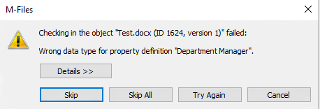 DocumentCache.cpp, 7509, Script execution failed. ((BeforeCheckInChangesFinalize::PropertyCalculator.MFEventHandlerBeforeCheckInChangesFinalize: 1624-1)) (0x800408BB) DocumentCache.cpp, 19216, Script execution failed. ((BeforeCheckInChangesFinalize::PropertyCalculator.MFEventHandlerBeforeCheckInChangesFinalize: 1624-1)) (0x800408BB) RPCMethodCallWithRetry.h, 27, Script execution failed. ((BeforeCheckInChangesFinalize::PropertyCalculator.MFEventHandlerBeforeCheckInChangesFinalize: 1624-1)) (0x800408BB) RPCMethodCallWithRetry.h, 27, Script execution failed. ((BeforeCheckInChangesFinalize::PropertyCalculator.MFEventHandlerBeforeCheckInChangesFinalize: 1624-1)) (0x800408BB) RPCDocumentOperations.cpp, 11772, Script execution failed. ((BeforeCheckInChangesFinalize::PropertyCalculator.MFEventHandlerBeforeCheckInChangesFinalize: 1624-1)) (0x800408BB) RPCDocumentOperations.cpp, 5811, Script execution failed. ((BeforeCheckInChangesFinalize::PropertyCalculator.MFEventHandlerBeforeCheckInChangesFinalize: 1624-1)) (0x800408BB) MCallInLoop.h, 712, Script execution failed. ((BeforeCheckInChangesFinalize::PropertyCalculator.MFEventHandlerBeforeCheckInChangesFinalize: 1624-1)) (0x800408BB) RPCDocumentOperationsHelper.cpp, 1939, Script execution failed. ((BeforeCheckInChangesFinalize::PropertyCalculator.MFEventHandlerBeforeCheckInChangesFinalize: 1624-1)) (0x800408BB) RPCDocumentOperationsHelperPrivate.cpp, 208, Script execution failed. ((BeforeCheckInChangesFinalize::PropertyCalculator.MFEventHandlerBeforeCheckInChangesFinalize: 1624-1)) (0x800408BB) RPCDocumentOperationsHelper.cpp, 9432, Script execution failed. ((BeforeCheckInChangesFinalize::PropertyCalculator.MFEventHandlerBeforeCheckInChangesFinalize: 1624-1)) (0x800408BB) RPCDocumentOperationsHelper.cpp, 10128, Script execution failed. ((BeforeCheckInChangesFinalize::PropertyCalculator.MFEventHandlerBeforeCheckInChangesFinalize: 1624-1)) (0x800408BB) VaultDBSessionEvents.cpp, 380, Script execution failed. ((BeforeCheckInChangesFinalize::PropertyCalculator.MFEventHandlerBeforeCheckInChangesFinalize: 1624-1)) (0x800408BB) VaultDBSessionEvents.cpp, 1690, Script execution failed. ((BeforeCheckInChangesFinalize::PropertyCalculator.MFEventHandlerBeforeCheckInChangesFinalize: 1624-1)) (0x800408BB) VaultScriptSessionTemplates.cpp, 275, Script execution failed. ((BeforeCheckInChangesFinalize::PropertyCalculator.MFEventHandlerBeforeCheckInChangesFinalize: 1624-1)) (0x800408BB) VaultScriptSessionTemplates.cpp, 340, Script execution failed. ((BeforeCheckInChangesFinalize::PropertyCalculator.MFEventHandlerBeforeCheckInChangesFinalize: 1624-1)) (0x800408BB) VaultScriptSessionTemplates.cpp, 340, Wrong data type for property definition "Department Manager". (0x8004009A) VaultScriptSessionTemplates.cpp, 523, Wrong data type for property definition "Department Manager". (0x8004009A) CoActiveScriptSite.cpp, 895, Wrong data type for property definition "Department Manager". (0x8004009A) CoActiveScriptSite.cpp, 737, Wrong data type for property definition "Department Manager". (0x8004009A) BeforeCheckInChangesFinalize::PropertyCalculator.MFEventHandlerBeforeCheckInChangesFinalize, 22, Wrong data type for property definition "Department Manager". (0x8004009A) CoDynamicCLRObjectWrapper.cpp, 552, Wrong data type for property definition "Department Manager". (0x8004009A) CoDynamicCLRObjectWrapper.cpp, 322, Wrong data type for property definition "Department Manager". (0x8004009A) ManagedError.cpp, 150, Wrong data type for property definition "Department Manager". (0x8004009A) VaultApplicationBase.cs, 257 (IL:45), Wrong data type for property definition "Department Manager". (0x8004009A) VaultApplicationBase.cs, 809 (IL:82), Wrong data type for property definition "Department Manager". (0x8004009A) MethodInfo.cs, 224 (IL:105), Wrong data type for property definition "Department Manager". (0x8004009A) CoreFunctionality.cs, 944 (IL:0), Wrong data type for property definition "Department Manager". (0x8004009A) ObjVerEx.cs, 1616 (IL:56), Wrong data type for property definition "Department Manager". (0x8004009A) PropertyCalculator 2.0.1: [MFilesAPI.ObjectVersionAndProperties SetAllProperties(MFilesAPI.ObjVer, Boolean, MFilesAPI.PropertyValues)], IL:-1, Wrong data type for property definition "Department Manager". (0x8004009A) CoVaultObjectPropertyOperations.cpp, 978, Wrong data type for property definition "Department Manager". (0x8004009A) CoVaultObjectPropertyOperations.cpp, 1004, Wrong data type for property definition "Department Manager". (0x8004009A) CoVaultObjectPropertyOperations.cpp, 1080, Wrong data type for property definition "Department Manager". (0x8004009A) ServerVaultObjectPropertyOperationsHelper.cpp, 415, Wrong data type for property definition "Department Manager". (0x8004009A) RPCObjectOperationsHelper.cpp, 109, Wrong data type for property definition "Department Manager". (0x8004009A) CoRPCOverCOM.cpp, 6808, Wrong data type for property definition "Department Manager". (0x8004009A) RPCDocumentOperations.cpp, 7389, Wrong data type for property definition "Department Manager". (0x8004009A) MCallInLoop.h, 712, Wrong data type for property definition "Department Manager". (0x8004009A) RPCDocumentOperationsHelper.cpp, 4192, Wrong data type for property definition "Department Manager". (0x8004009A) RPCDocumentOperationsHelper.cpp, 3724, Wrong data type for property definition "Department Manager". (0x8004009A) RPCDocumentOperationsHelperPrivate.cpp, 7499, Wrong data type for property definition "Department Manager". (0x8004009A) RPCDocumentOperationsHelperPrivate.cpp, 6947, Wrong data type for property definition "Department Manager". (0x8004009A) RPCDocumentOperationsHelperPrivate.cpp, 8843, Wrong data type for property definition "Department Manager". (0x8004009A) RPCDocumentOperationsHelperPrivate.cpp, 9592, Wrong data type for property definition "Department Manager". (0x8004009A) (M-Files 22.4.11321.4 2022-07-27T07:05:13.898Z)