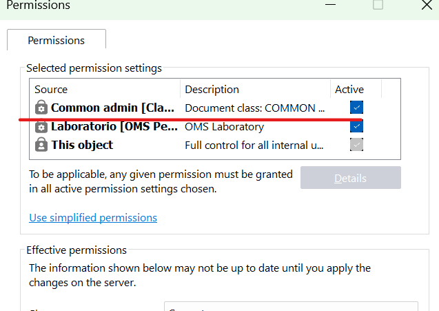 as you can see in this image: the object has two value list selected, and by this, no one can see the document, but if i deactivate the first option (Common Admin given by class) and LAboratorio is still selected, permissions work as expected