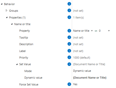 • I put a new property on templates called "Document Name or Title" and this property has the predetermined names in it. I then made a simple metadata card rule saying that original "Name or title" gets the value from this property and then I set it to Read-Only(See screenshots below). This all works, and users cannot change the name directly via the Name or title as it's Read-Only, however they can just press F2 on the document itself and change it there overriding this rule. This is on classic client.