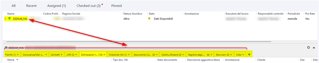 If no items appear in the tab, verify that there are documents of the specified class that reference the workspace object (2026.M_IVA – …). If no such documents exist, the tab will be of course empty.