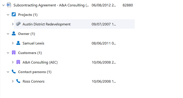 I would like to pull object linked to a document object via any property as shown in this image via COM API. So, I want to get projects, owner, customers and contact person