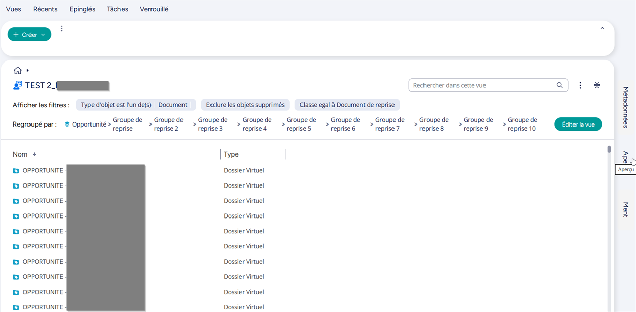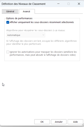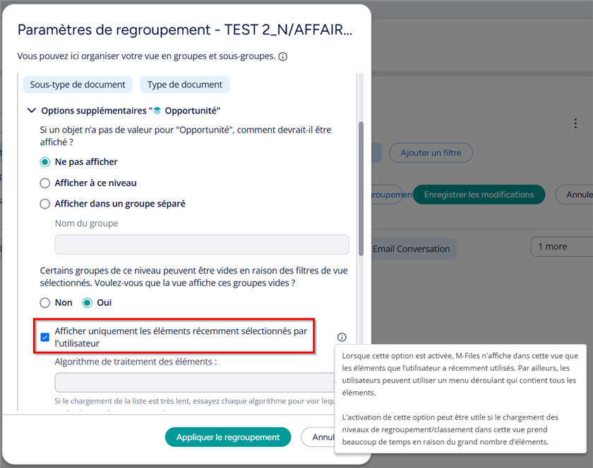 Dans le Desktop Classic, nous utilisons très régulièrement l’option de regroupement dans les vues « Afficher uniquement les sous‑dossiers récemment sélectionnés ».