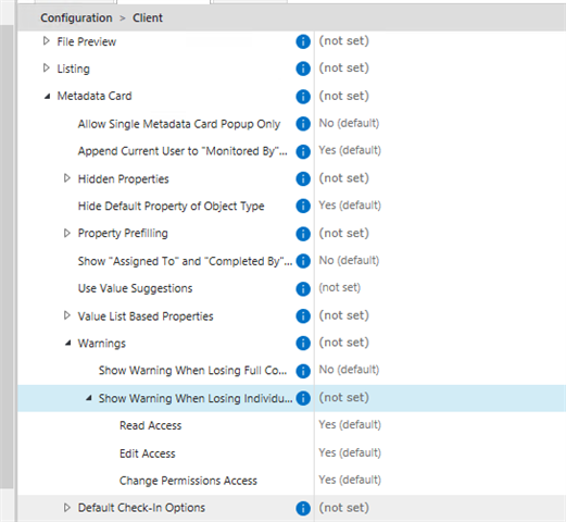 Advanced Vault Settings > Configuration > Client [Yes] > Classic Desktop > Metadata > Warnings > Show warnings when losing individual control:
