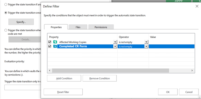 I am trying to make minor modifications to the Compliance Kit Change Request module - I would like to include additional states. This allows me to check for a separate document prior to approving the change request. However, it appears for the automatic trigger (identified with 'A' in my screen shot), the compliance kit relies on the property 'Affected Working Copies' to not be empty. Because I have added these states, I do not know how the affected working copies is actually set, so I cannot seem to figure out how to include consideration for my new states.  Any advice is appreciated.