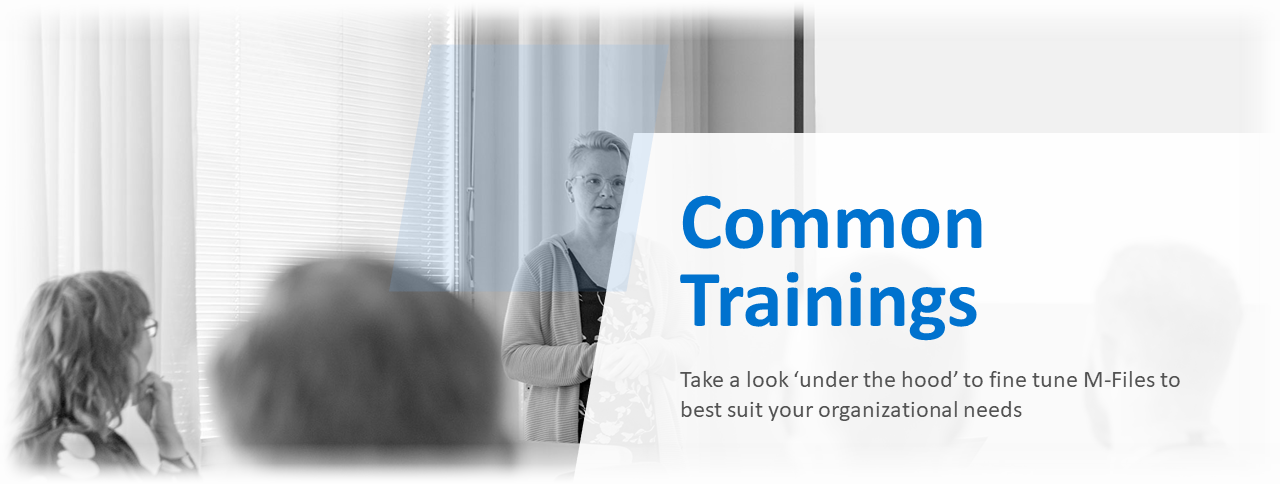 To help you get the most from M-Files, we schedule throughout the year commonly available training courses in Finnish per request. Common trainings follow the Business Administrator training path that takes a look ‘under the M-Files hood’ providing participants with knowledge to fine tune M-Files to best suit organizational needs.