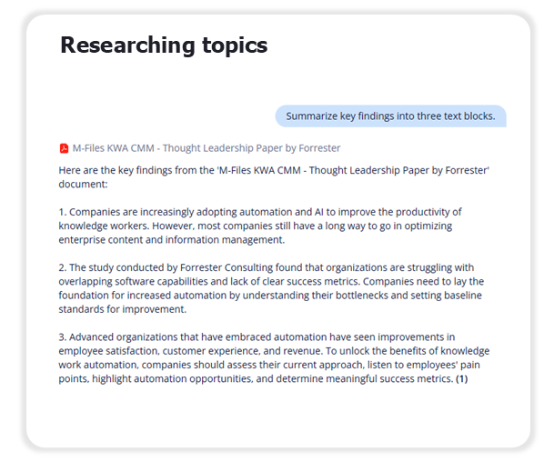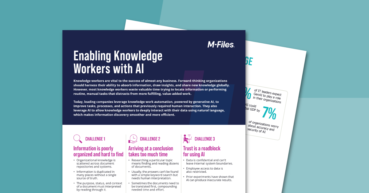 Today, leading companies leverage knowledge work automation, powered by generative AI, like M-Files Aino, to improve tasks, processes, and actions that previously required human interaction. They also leverage AI to allow knowledge workers to deeply interact with their data using natural language, which makes information discovery smoother and more efficient. Learn more.
