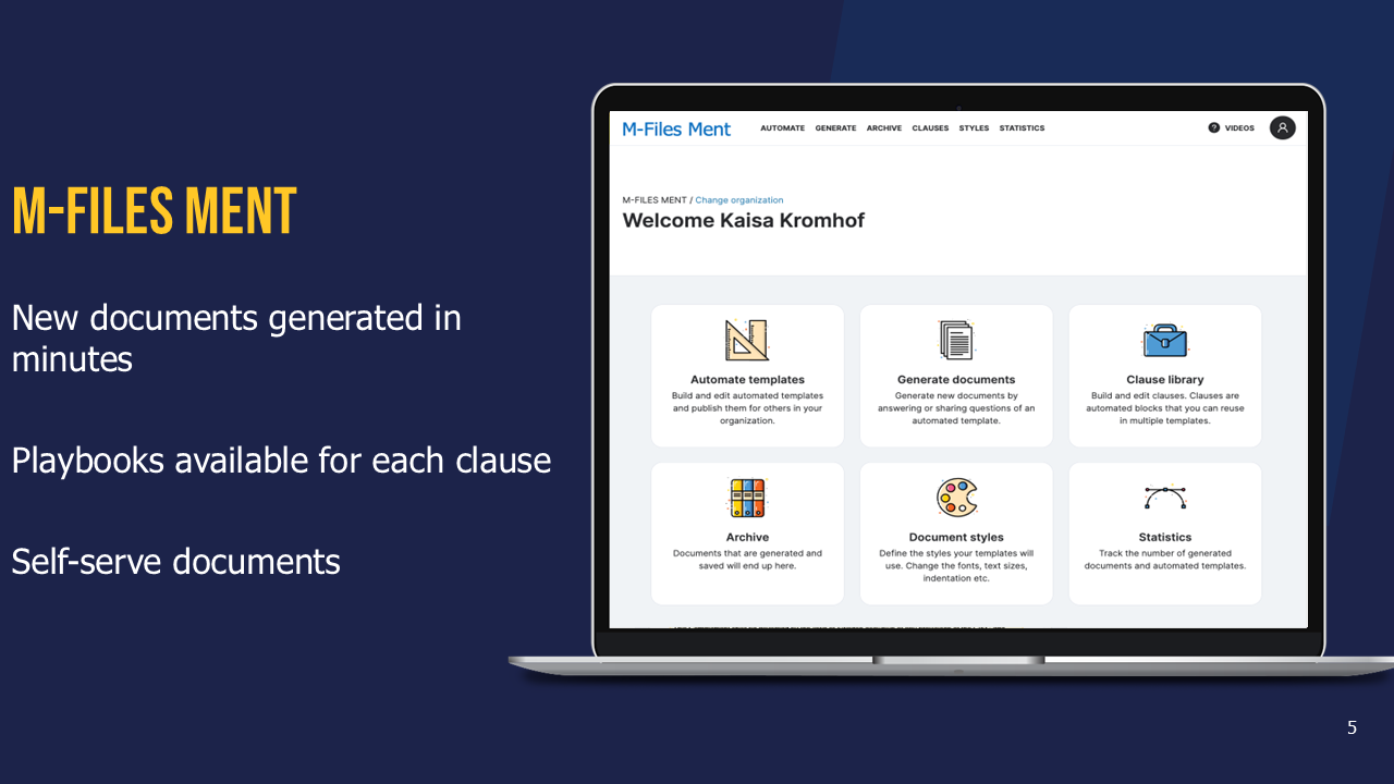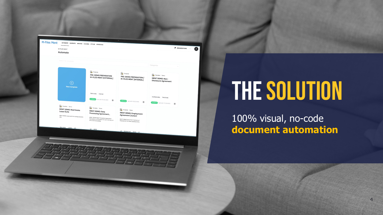 Are you tired of spending countless hours on manual document creation, managing version control, and searching for specific clauses? We have the perfect solution for you! M-Files Ment is a next-generation document automation tool that helps seamlessly generate complex, data-driven documents quickly and consistently. M-Files Ment is the first 100% visual, no-code automation interface tool that removes the barriers of complex document automation processes. M-Files Ment empowers organizations with one-of-a-kind self-service tools that enable knowledge workers to release automated content anywhere and generate documents directly from third-party input in a secure and compliant way.